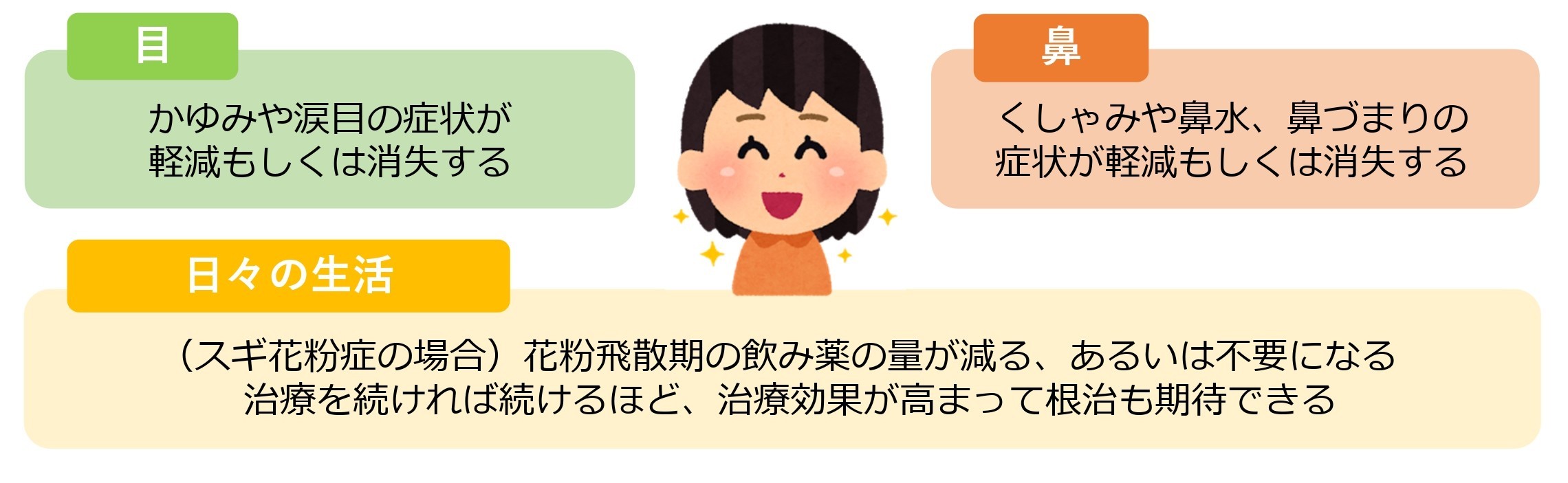 ・アレルギー体質が改善されるため、治療効果は一過性ではなくその後も継続します。