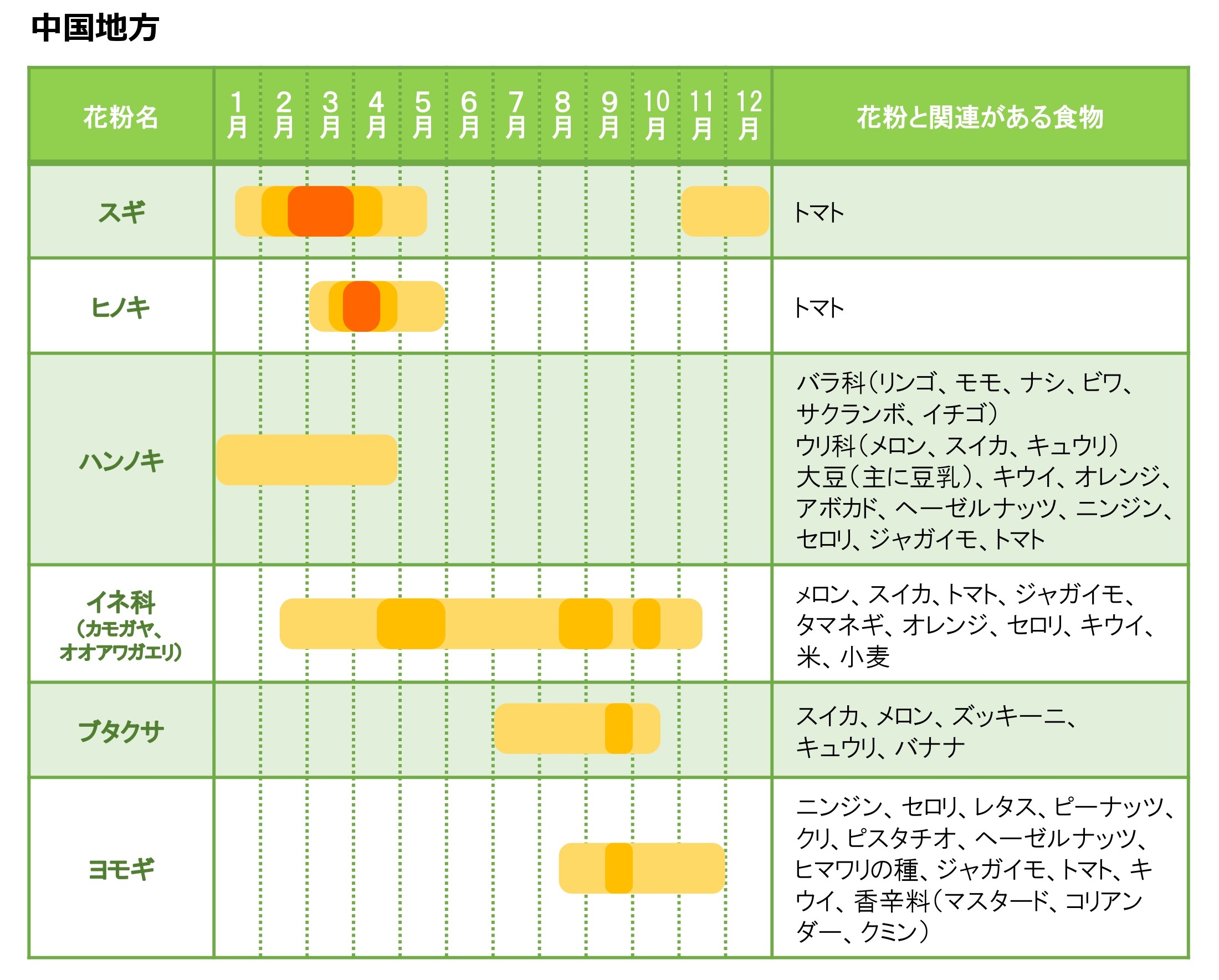 また、それぞれの花粉にアレルギー反応を示す方は表の横に記載している食物で口腔アレルギーを発症する可能性が指摘されています。